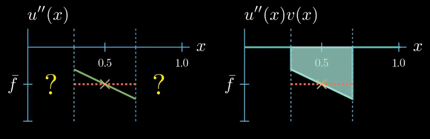 $$ {\color{red} \int_0^1 u''(x)v(x)} = \int_0^1 f(x)v(x) $$ The second derivative of $u$ is unknown because $u$ is our unknown. The test function is the same as on the right hand side of the equation, which we have arbitrarily chosen as constantly $1$ for now. Finally the second derivative of $u$ times the test function $v$ is also unknown, because the second derivative of $u$ is unknown so the second derivative of $u$ times the test function $v$ can be a function of arbitrary shape